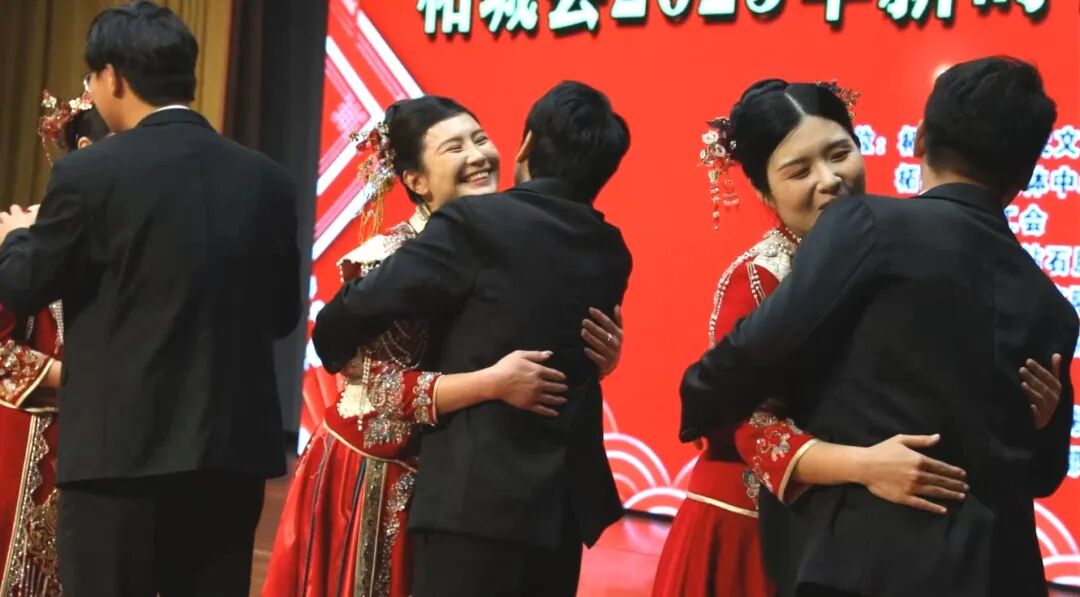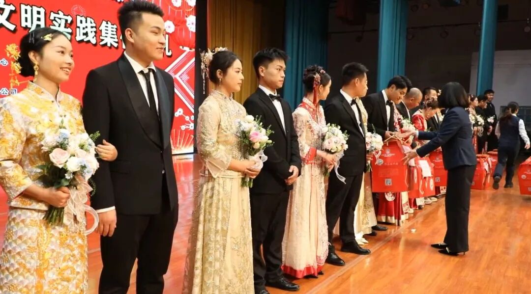 “互敬互爱、互信互勉……”在最庄严的宣誓环节,新人们举起右手,铿锵誓言回荡在会场每个角落,这不仅是对彼此的郑重承诺,更展现出新时代青年对婚姻责任、家庭担当的深刻理解。随后,新郎们向新娘献上手捧花,娇艳鲜花象征着甜蜜爱情,也让现场浪漫氛围再度升级。新人代表在发言中承诺,将以今日婚礼为起点,用心经营家庭,更会主动向身边人传递“文明节俭”的婚俗理念,争当新时代文明新风的践行者与传播者。